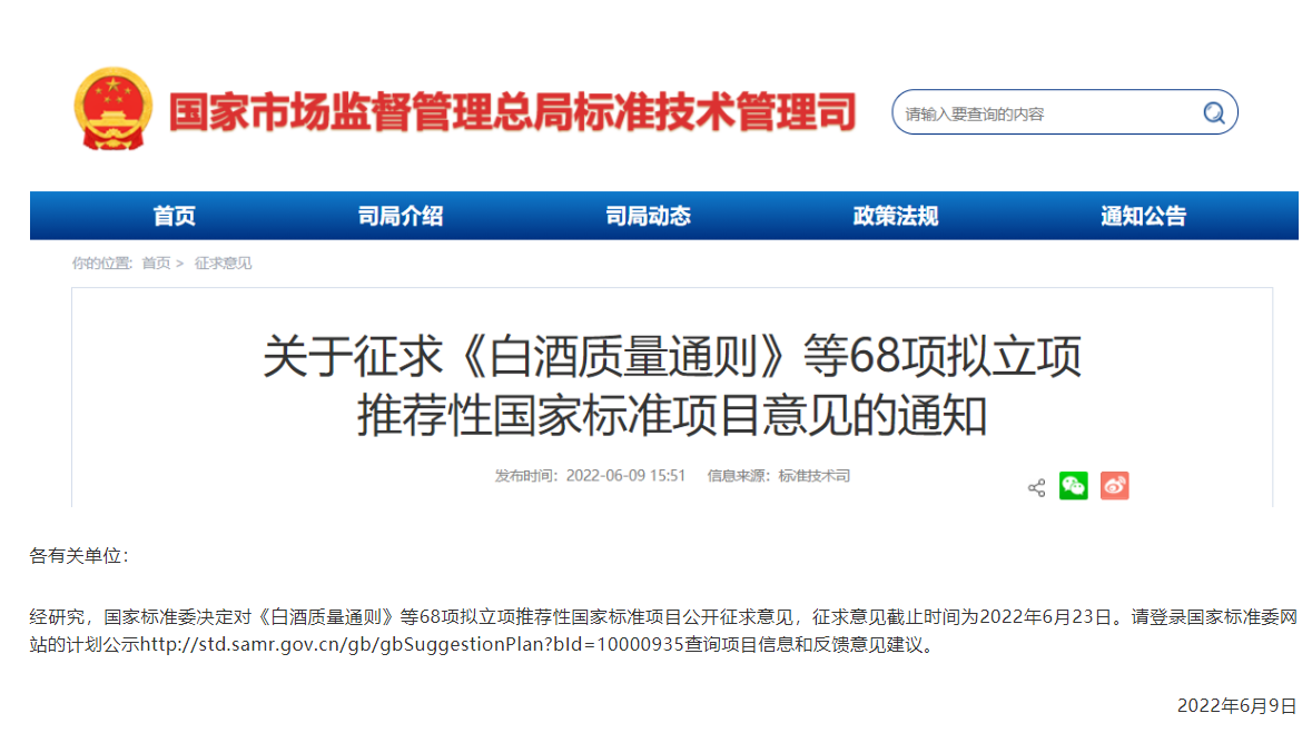6月9日,国家市场监督管理总局标准技术管理司发布关于征求《白酒质量通则》等68项拟立项推荐性国家标准项目意见的通知。